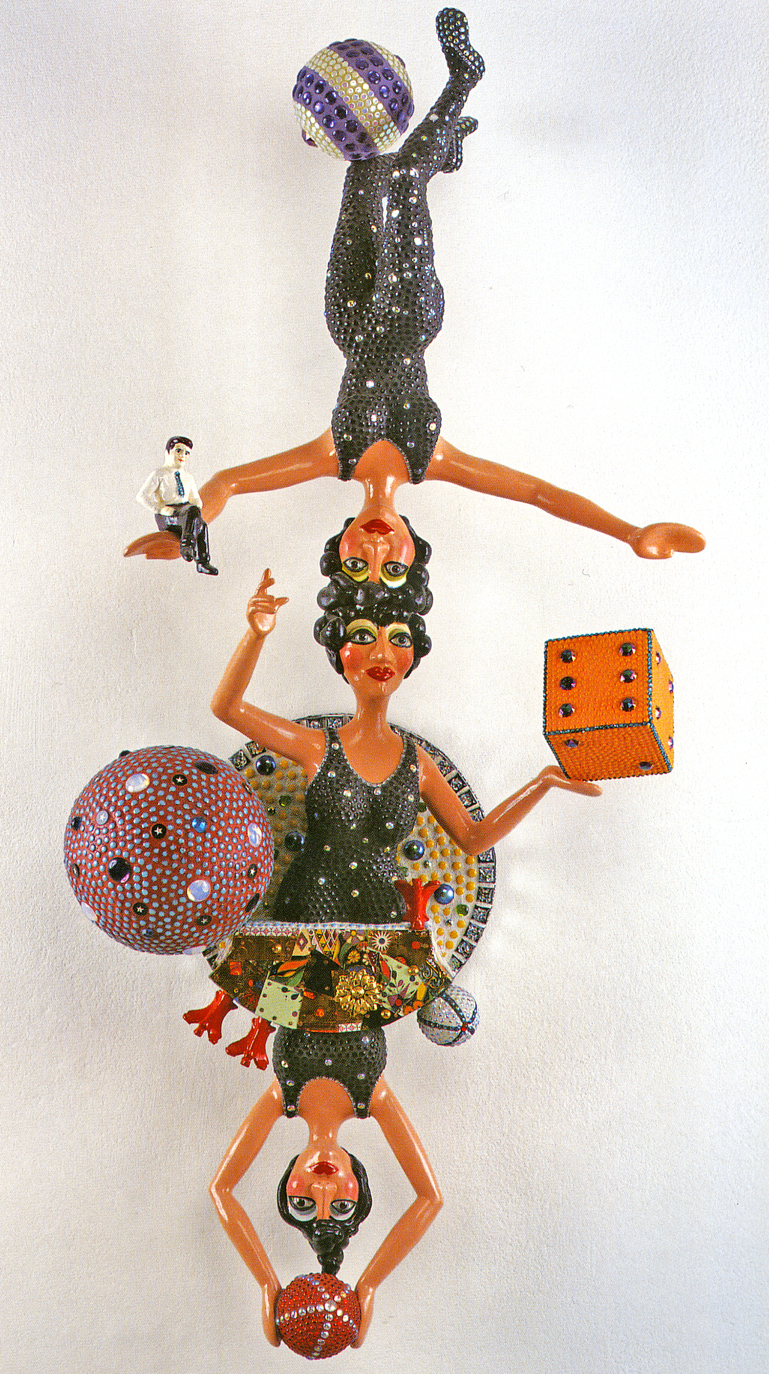 Laurel Reuter: “Underpinning the artist’s personal story acted out within the setting of the circus (in the exhibition Come One, Come All) is her search for physical health and mobility. Having struggled with lupus much of her adult life, her health issues were compounded by a near-fatal care accident in 2000. The artist became mostly wheel-chair bound for the next few years – and she dreamed of the circus. But she never stopped working in her studio. “ I thought about balance, about acrobats flying through the air in total freedom. I imagined Madame Twisto (2002) a circus woman with her legs twisted together like a Dairy Queen.” In Onofrio’s sculpture she is transformed into a glamorous woman, ensconced under an arch reminiscent of Bernini’s canopy for the papal altar in St. Peter’s Basilica in Rome. Four equally gorgeous miniature women hold court at her feet. According to the artist, “Madame Twisto is a sideshow as well as a portrait of my own physical vulnerability. The circus became a metaphor for my healing.”