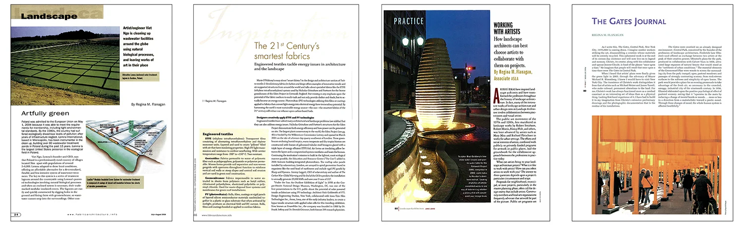 Landscape Architecture (LAM) magazine published a series of my pieces including profiles of artists Brad Goldberg and Athena Tacha who work across disciplines. Another article for LAM describes collaborative relationships between artists and landscape architects including Ann Hamilton and Michael Mercil with Michael Van Valkenburgh for Teardrop Park in New York City, and Jody Pinto and Igancio Bunster Ossa of Wallace, Roberts, Todd LLC for the Santa Monica Promenade.